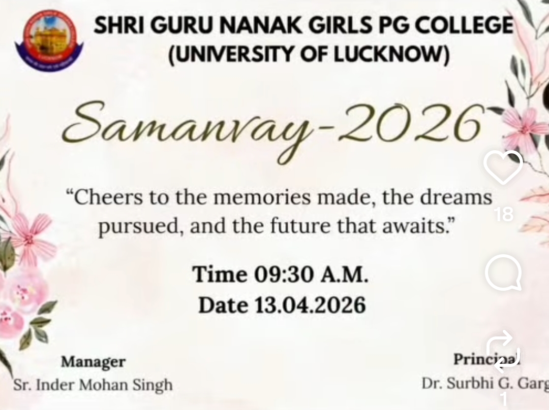 Read More →A figure of compassion, justice, equality, love and unity, Shri Guru Nanak Sahib illuminated a divine path for humanity. Following this divine path, the Sikh Education Society recognized the significance of girls’ education in the modern society. This thought was provided with the grab of reality in 2000 in the form of Shri Guru Nanak Girls’ PG College, self-finance college duly affiliated from University of Lucknow. Since then the college is spreading the light of education in the society especially for the girl students. Women education greatly influences the progress of any nation. For the upliftment of the society it is needed that its women are educated. Keeping this view in mind, India too is marching towards ‘Women Empowerment’ through women education. Value enriched education not only enhances vocational skills to survive in competitive environment but also helps in character building, moral development and self realization of the individual.