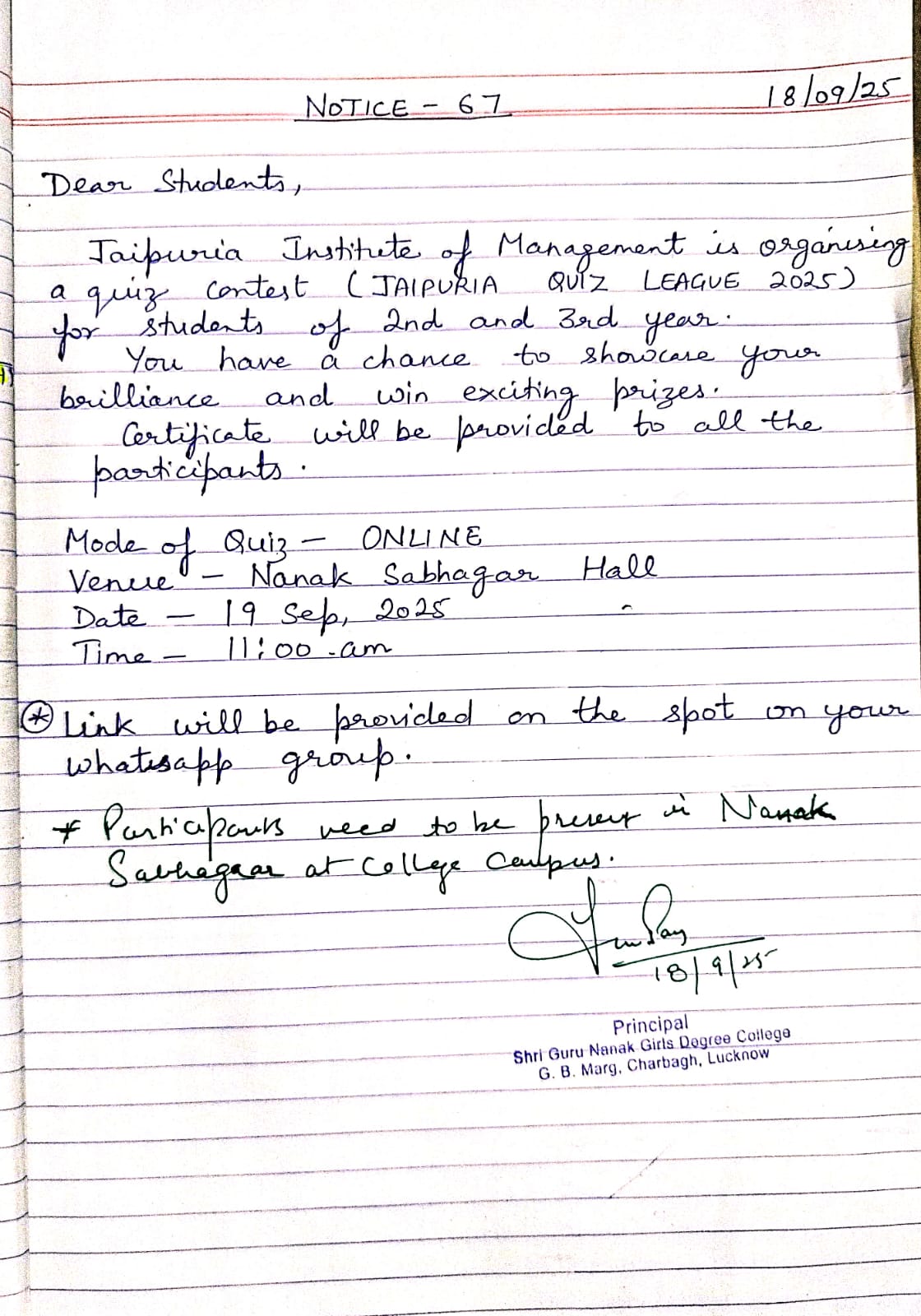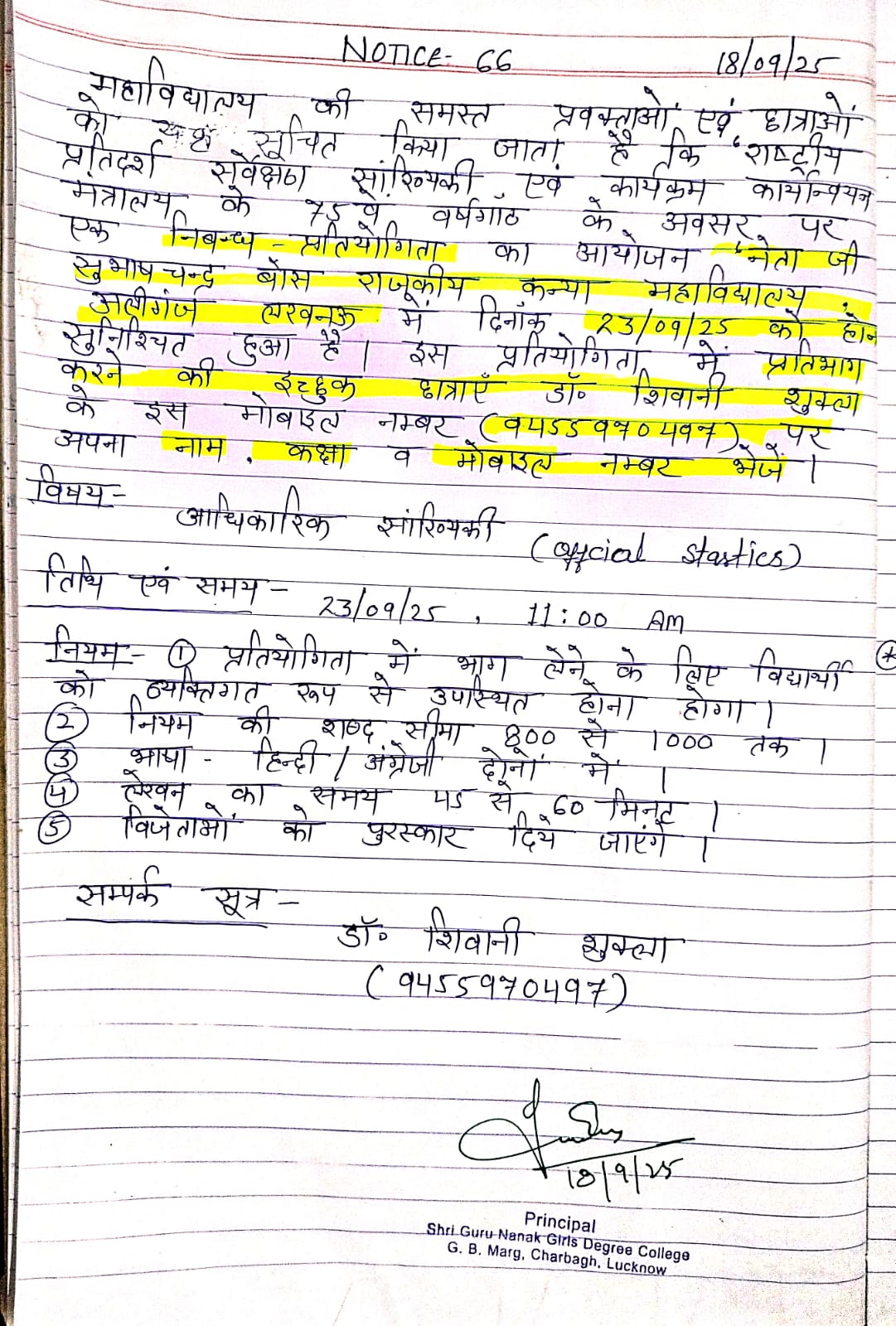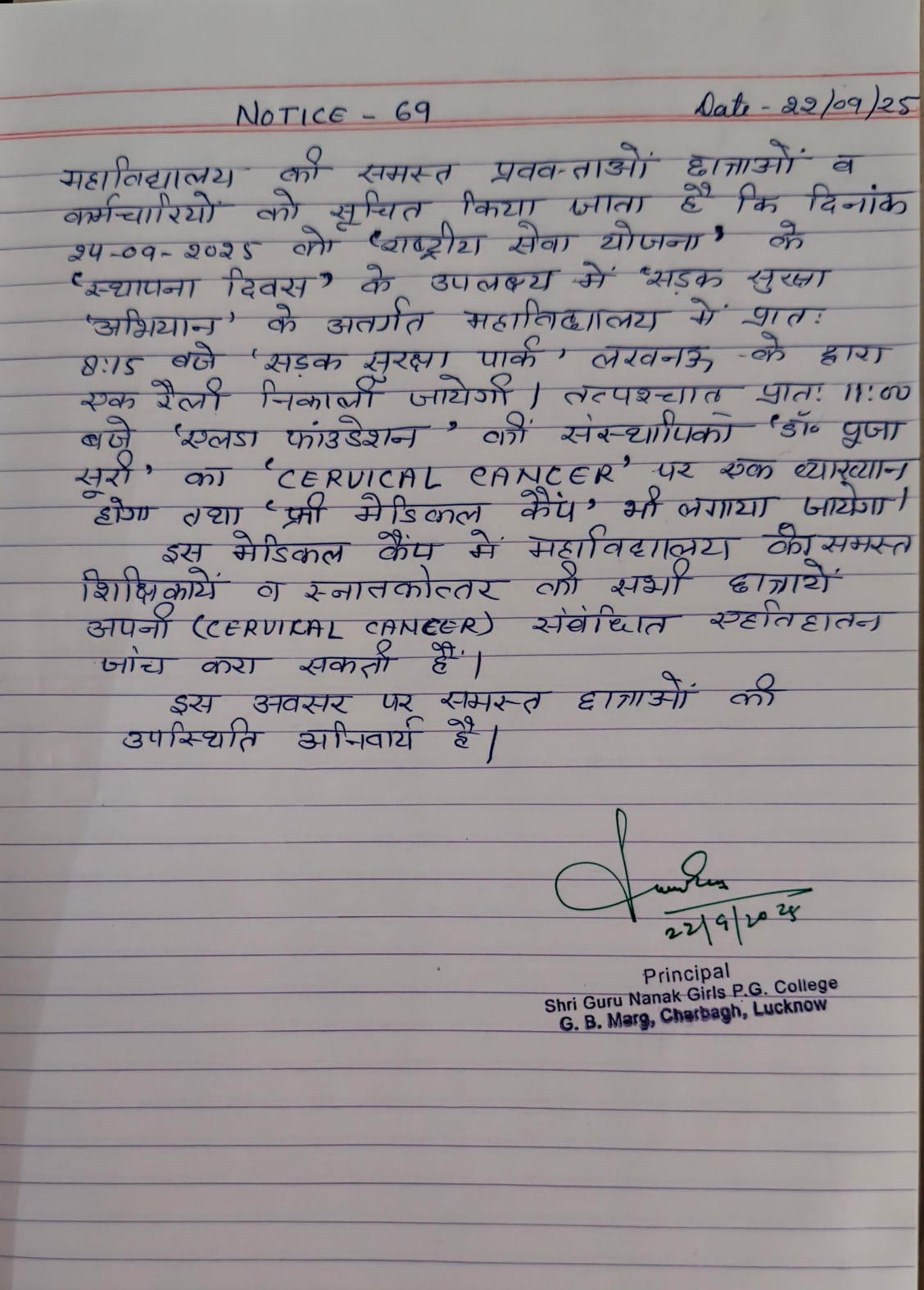 A figure of compassion, justice, equality, love and unity, Shri Guru Nanak Sahib illuminated a divine path for humanity. Following this divine path, the Sikh Education Society recognized the significance of girls’ education in the modern society. This thought was provided with the grab of reality in 2000 in the form of Shri Guru Nanak Girls’ PG College, self-finance college duly affiliated from University of Lucknow. Since then the college is spreading the light of education in the society especially for the girl students. Women education greatly influences the progress of any nation. For the upliftment of the society it is needed that its women are educated. Keeping this view in mind, India too is marching towards ‘Women Empowerment’ through women education. Value enriched education not only enhances vocational skills to survive in competitive environment but also helps in character building, moral development and self realization of the individual.